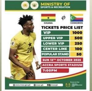 The Ghana Football Association (GFA) and the National Sports Authority have officially launched advanced ticket sales for the final 2026 FIFA World Cup qualifier between Ghana and Comoros, set for Sunday, October 12 at the Accra Sports Stadium.