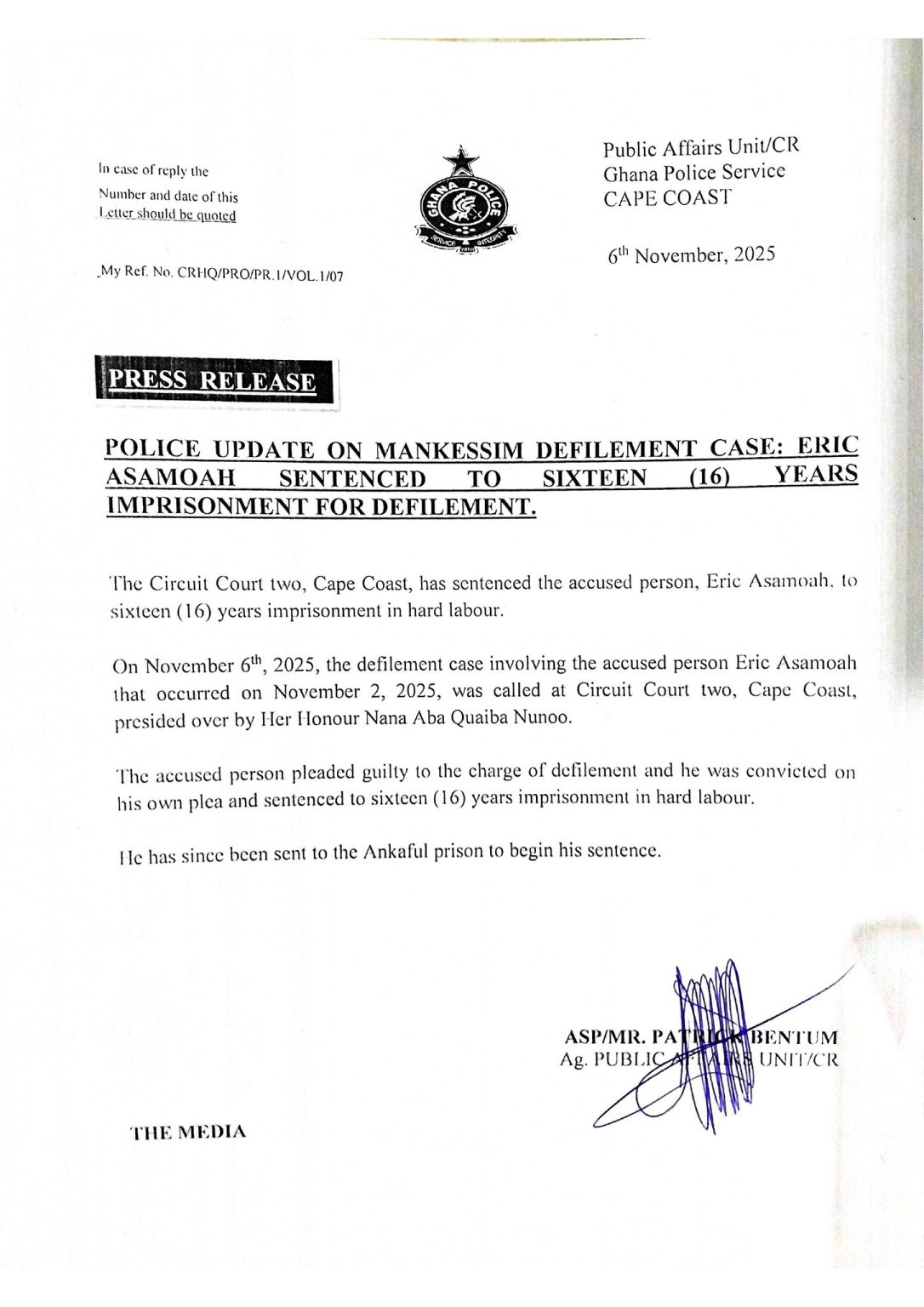 According to a police release, Eric Asamoah pleaded guilty to the charge of defilement, and he was convicted on his own plea by Her Honour Nana Aba Quaiba Nunoo.