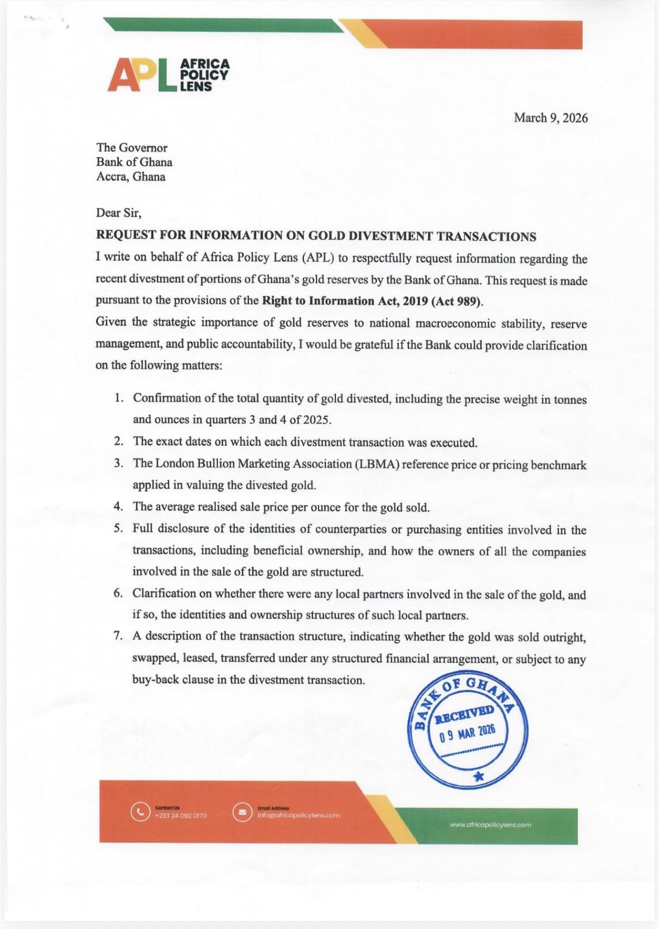 Policy Think Tank Africa Policy Lens (APL) has formally requested detailed disclosures from the Bank of Ghana (BoG) regarding the divestment of a portion of the nation’s gold reserves in the last quarter of 2025.