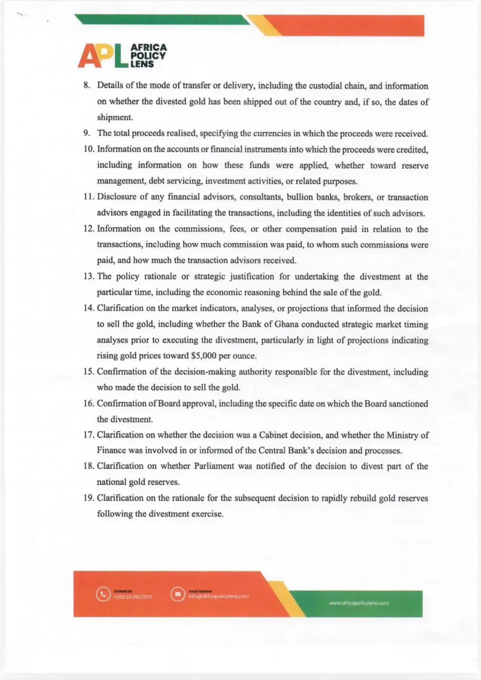 APL is requesting the Bank of Ghana to release 20 categories of information, including: