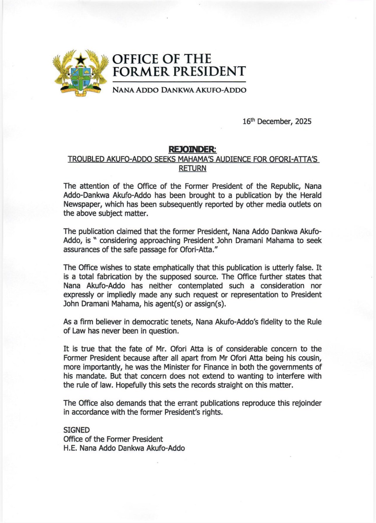 Responding to a publication by The Herald Ghana, the former President described the report as completely false, insisting that he has neither contemplated nor made any direct or indirect request to President Mahama, his representatives, or any intermediaries regarding Mr Ofori-Atta’s situation.
