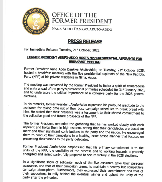 Former President Nana Addo Dankwa Akufo-Addo on Tuesday, October 21, 2025, hosted a breakfast meeting with the five presidential aspirants of the New Patriotic Party (NPP) at his private residence in Nima, Accra.