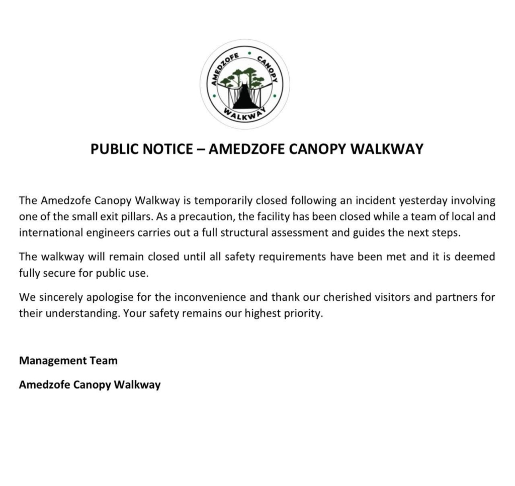 A section of the Amedzofe Canopy Walkway in the Volta Region has suffered a partial structural failure, resulting in minor injuries to a number of visitors and forcing the immediate shutdown of the popular tourist site.
