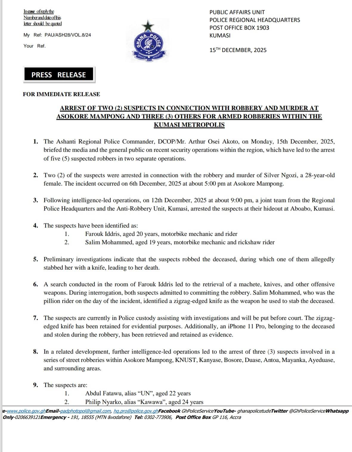 In a separate but related operation, police also arrested three other individuals suspected to be behind multiple street robberies in parts of Kumasi and surrounding communities, including Asokore Mampong, KNUST, Kenyasi, Bosore, Duase, Antoa, Mayanka, and Ayeduase.