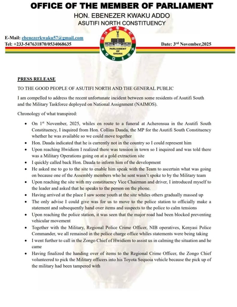 Narrating his side of the story, the MP explained that on November 1, 2025, he was en route to a funeral at Achrensua in the Asutifi South Constituency when he was informed of an ongoing tense standoff between residents and military officers conducting an anti-illegal mining operation.