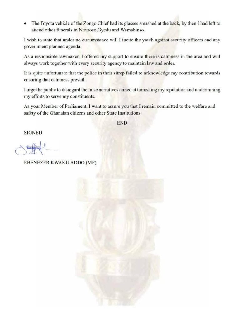 In the statement dated November 3, 2025, Mr. Addo described the reports linking him to the attack as “an unfortunate misunderstanding”, emphasizing that his actions on the day were solely aimed at calming tensions, not inciting violence.