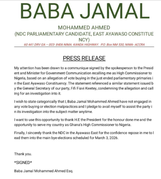 Despite the controversy, Baba Jamal expressed gratitude to President John Dramani Mahama for the confidence reposed in him during his tenure as Ghana’s envoy to Nigeria, describing the opportunity as a privilege to serve the nation. He also thanked delegates in Ayawaso East for the mandate they gave him to lead the party into the March 3, 2026, parliamentary by-election.