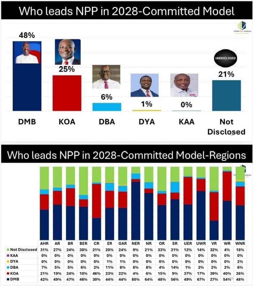 In a result published Friday afternoon, Global InfoAnalytics showed Bawumia has significantly improved from the last poll result to 48%, while his closest contender, Kennedy Agyapong, has dropped from the last poll result to 25%.