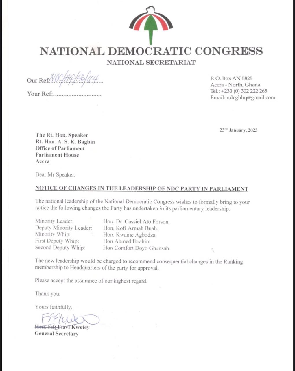 This was contained in a letter signed by the party’s General Secretary Fiifi Kwetey, to the Speaker of Parliament, Alban Bagbin, from the National Democratic Congress dated January 23, 2023.