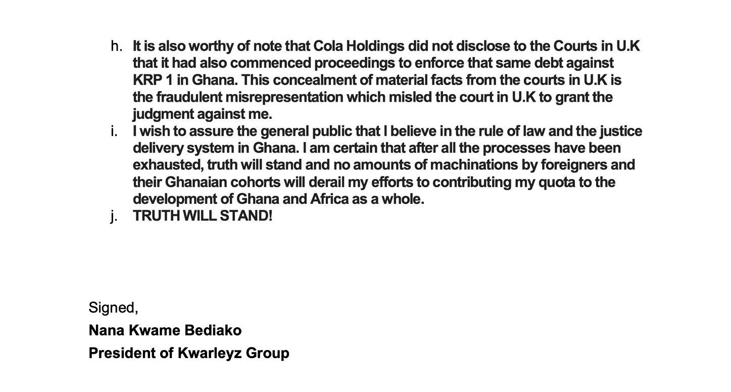 The statement was signed by Mr Bediako in his capacity as President of the Kwarleyz Group.