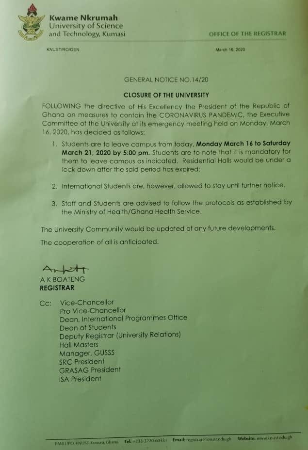 A communique signed by the Registrar, AK Boateng said the decision to shut down KNUST came up after an emergency Executive Committee meeting today, Monday, March 16, 2020.