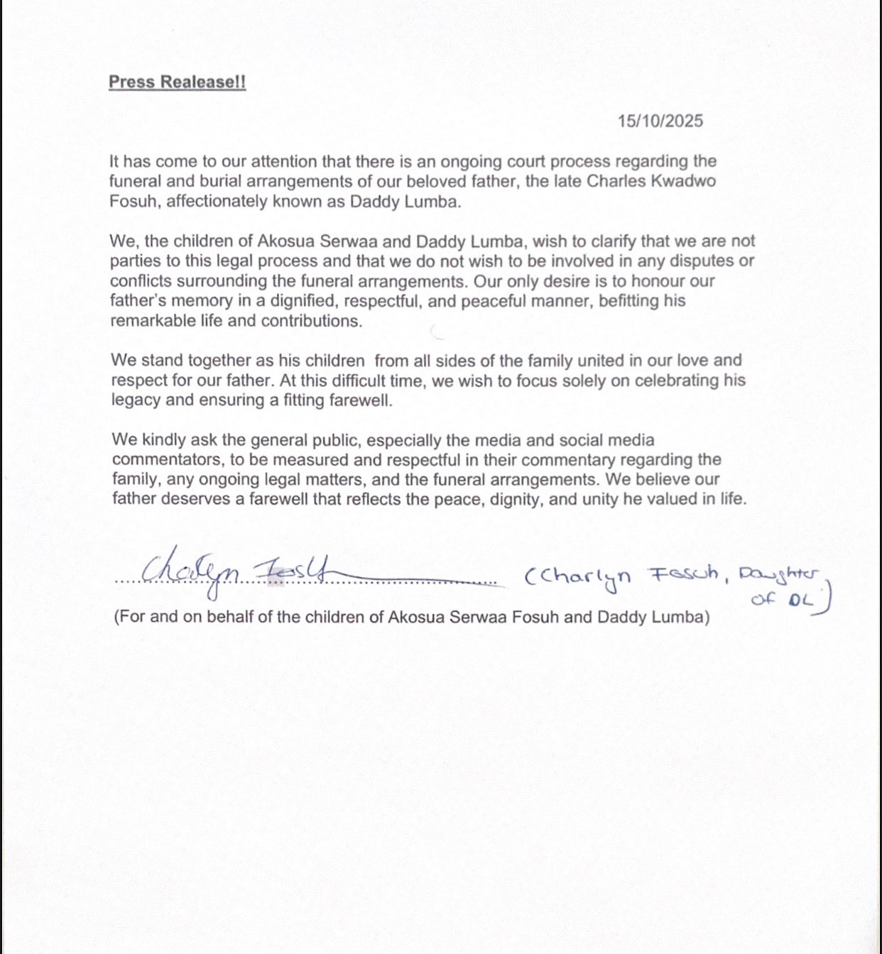 “We, the children of Daddy Lumba and Akosua Serwaa, wish to clarify and formally state that we are not parties to any legal process,” parts of their statement read.