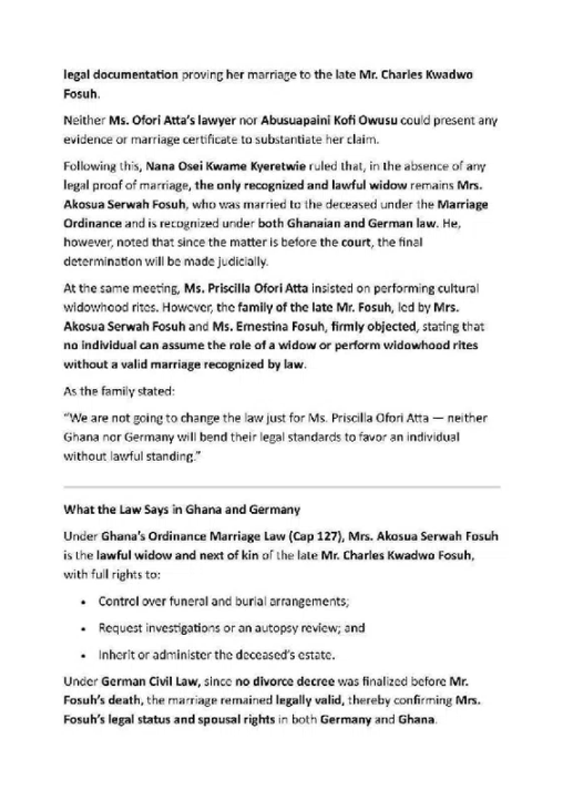 “At the same meeting, Priscilla Ofori Atta insisted on performing cultural widowhood rites. However, the family of the late Mr Fosuh, led by Mrs Akosua Serwah Fosuh and Ms Ernestina Fosuh, firmly objected, stating that no individual can assume the role of a widow or perform widowhood rites without a valid marriage recognised by law,” the statement added.