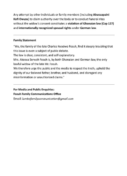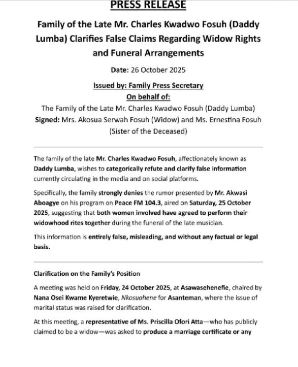 “The family of the late Charles Kwadwo Fosuh, affectionately known as Daddy Lumba, wishes to categorically refute and clarify false information currently circulating in the media and on social platforms… suggesting that both women involved have agreed to perform their widowhood rites together during the funeral of the late musician.