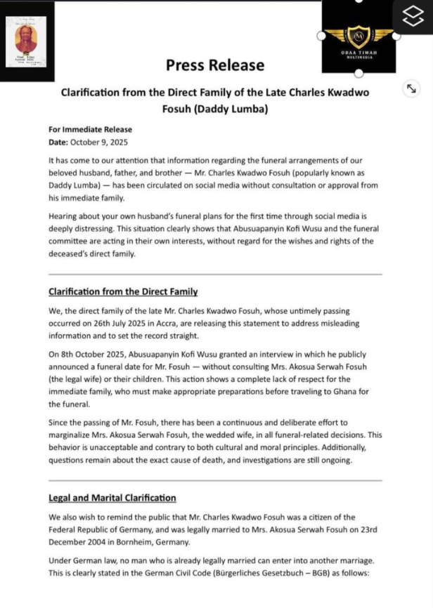 In a statement issued on Thursday, 9 October 2025, the family said they were stunned to learn about the funeral date through social media, accusing Abusuapanyin Kofi Wusu and the funeral committee of acting without consultation.