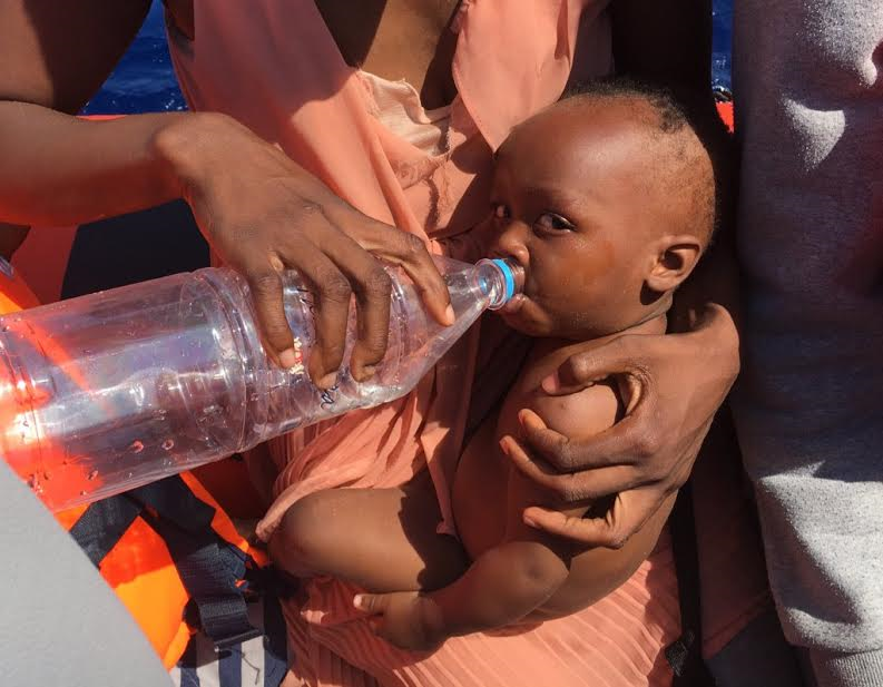 The series of rescue mission, which was captured on video shows the desperate migrants, most of them from Eritrea and Somalia, jumping into the water from a crowded wooden boat to swim to the coast guard vessels and others cheering as babies and children are carried on to the rescue ships.