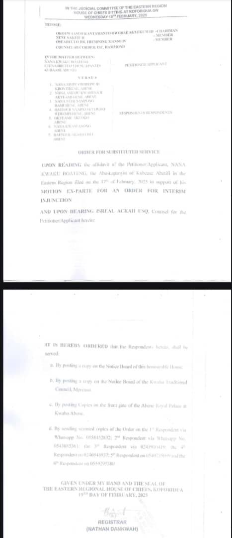 In a related matter, Daasebre Akuamoah Agyapong II secured a restraining order against Akyeamfour Asiedu Agyeman, the Abetifihene, who had styled himself as the acting president of the Kwahu Traditional Council.