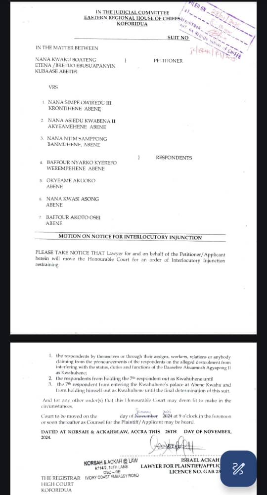According to the court documents, Daasebre Akuamoah Agyapong II stated that “the Abetifihene’s actions are unlawful and constitute a threat to my position as the Omanhene of Kwahu.”
