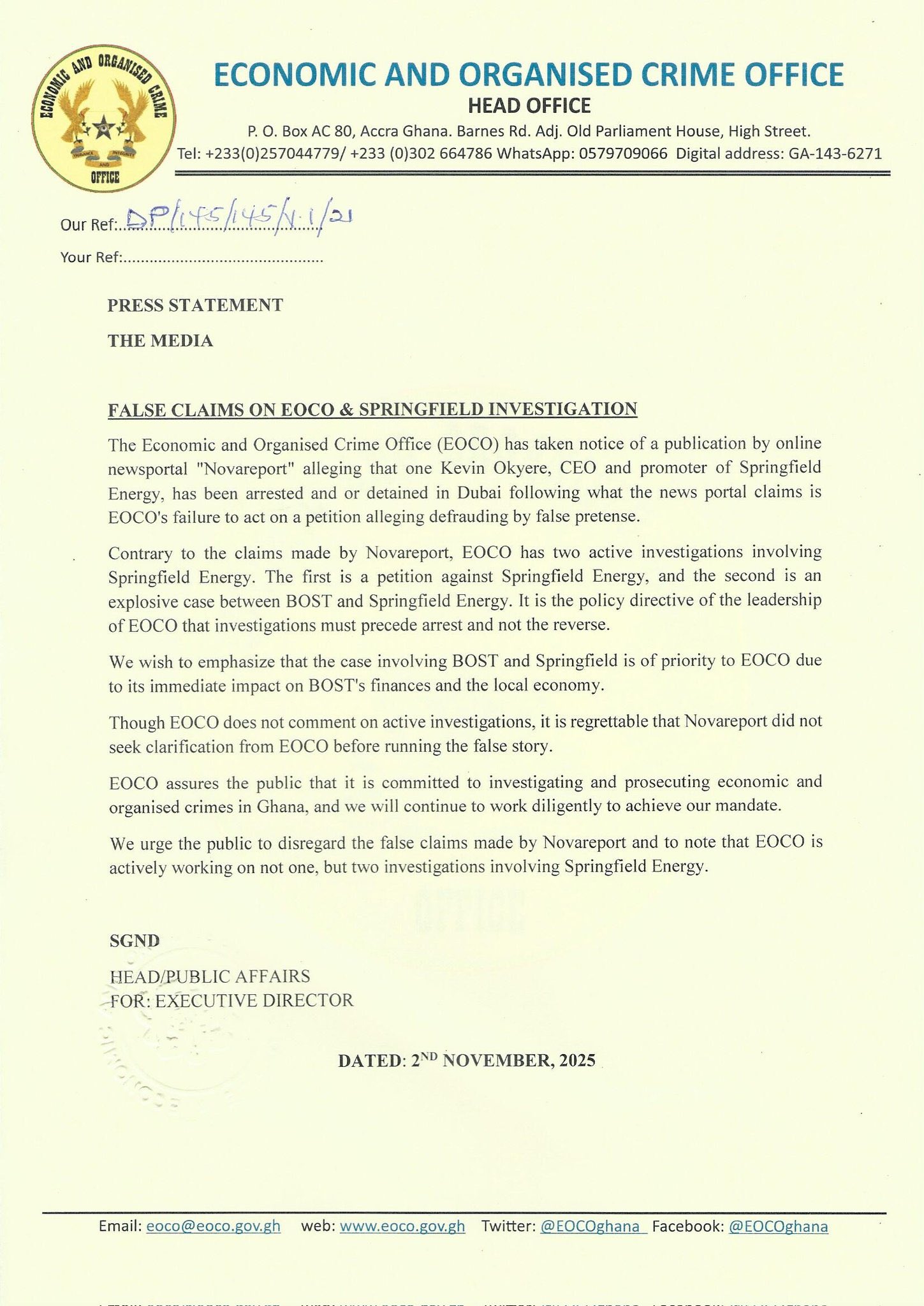The Economic and Organised Crime Office (EOCO) has dismissed reports circulating online that Mr. Kevin Okyere, Chief Executive Officer of Springfield Energy, has been arrested or detained in Dubai following EOCO’s alleged inaction on a fraud petition.