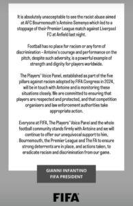 “Everyone at FIFA, The Players’ Voice Panel, and the entire football community stands firmly with Antoine,” Infantino said. “We will continue to offer our full support to him, to Bournemouth, the Premier League, and The FA. Strong deterrents must be in place, and meaningful action must follow, to eliminate racism and discrimination from our game.”