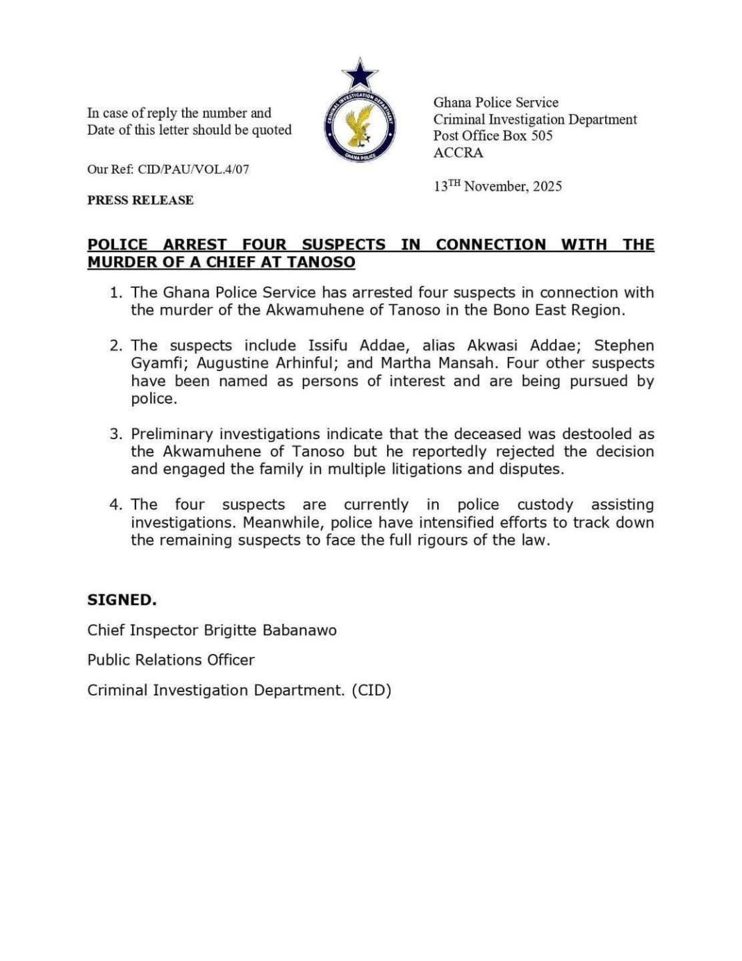 The Criminal Investigation Department (CID) of the Ghana Police Service has arrested four individuals in connection with the killing of the Akwamuhene of Tanoso in the Bono East Region.