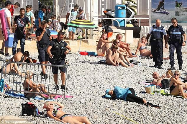Images of the confrontation on Tuesday show at least four police officers standing over the woman who was resting on the shore at the town’s Promenade des Anglais, the scene of last month’s Bastille Day lorry attack.