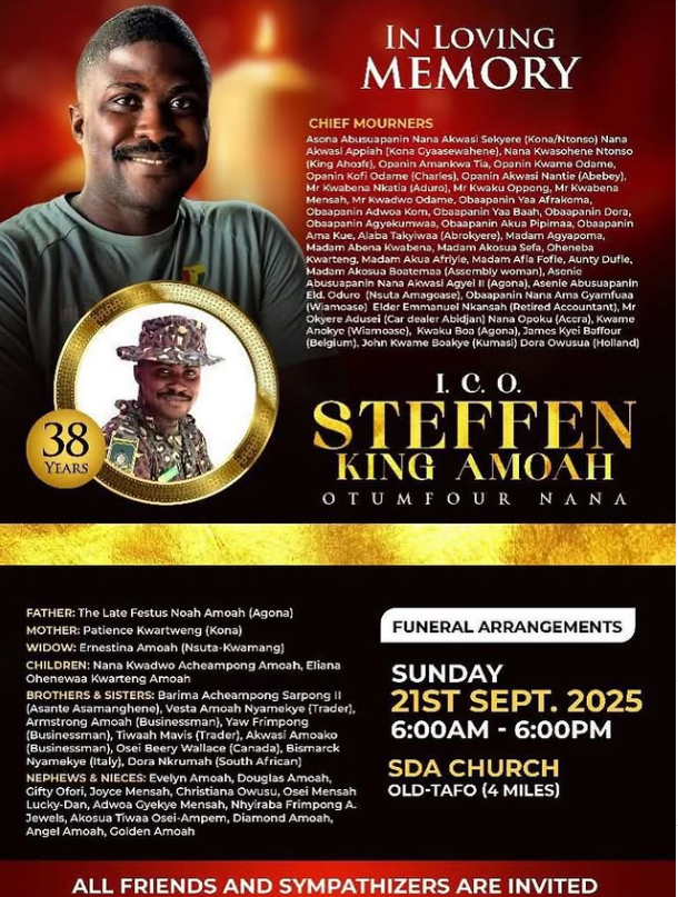 Mr. Amoah, aged 38, will be laid to rest on Sunday, September 21, 2025, at the Seventh-Day Adventist (SDA) Church, Old-Tafo (4 Miles), Kumasi.