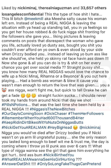 This the type of hoe shit I hate... This lil bitch @meekmill aka Meesha salty cause his woman left em. Instead of being a REAL NIGGA & leaving the situation with ya head up standing tall, you in ya feelings so you get her house robbed & do fuck nigga shit fronting for the followers she gave you... liking pictures & leaving comments on posts that disrespect the woman who gave you life, actually loved yo dusty ass, bought you shit you couldn't ever afford on yo own & even stood by your side when Drizzy bodied you.. instead of leaving yo bum ass like she should've, she held yo skinny rat face havin ass down !!! Now she gone & all you can do is try & shit on her every chance you get over social media ?? Straight pussy shit... you know how many REAL NIGGAS would love the chance to wife up a Nicki Minaj, Rihanna or a Beyonce' & you out here playing.... Had a bomb ass woman & blew it cause you wasn't man enough to return the love that was given.... you a ? ass nigga, won't fight me, but quick to tell Drake he can get a fade ??? straight fuckin sucka... I shoulda never took my hands from around Nicki that day we shot #PillsNPotions... that was the last time she been held by a REAL NIGGA !!! #NiggasIsTheNewBitches #OurDayIsComingSoon#DickChaser #ThemHerFollowers #iRememberWhenYouHad600ThousandB4Her#KeepRidinDirtBikesWitYoNutsOnNiggasButts #NickiGetYouAREALMAN #HeyBigHead ? @nickiminaj