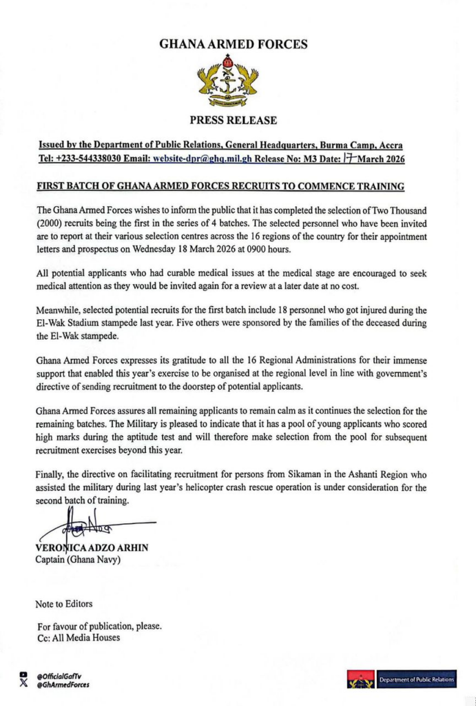 The selected recruits are required to report to designated centres across Ghana’s 16 regions on Wednesday, March 18, at 9:00 a.m., where they will receive their appointment letters and prospectus ahead of the start of training.