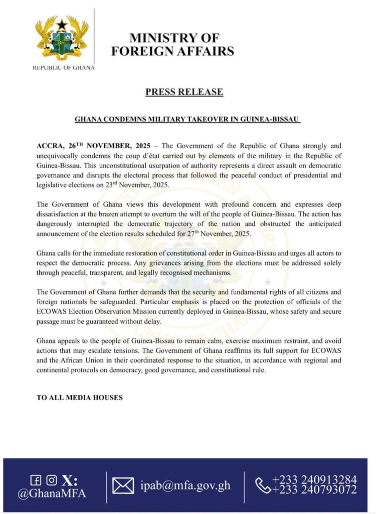 The Government of Ghana has denounced the military takeover in Guinea-Bissau, branding it an illegal and unconstitutional act that poses a serious threat to democratic stability in the country.