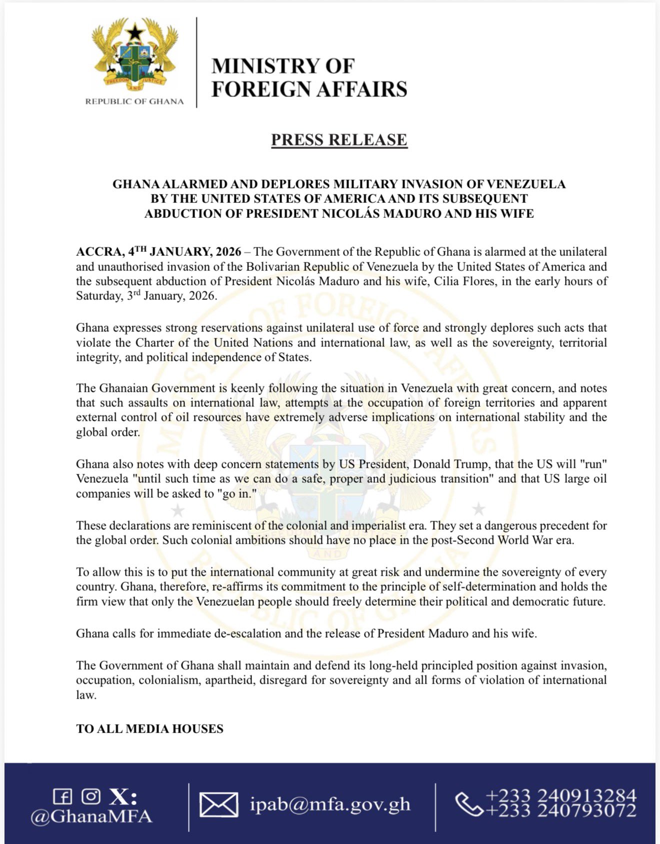 The Government of Ghana has voiced strong condemnation over what it describes as an unauthorised and unilateral military incursion by the United States into Venezuela, resulting in the abduction of President Nicolás Maduro and his wife, Cilia Flores.