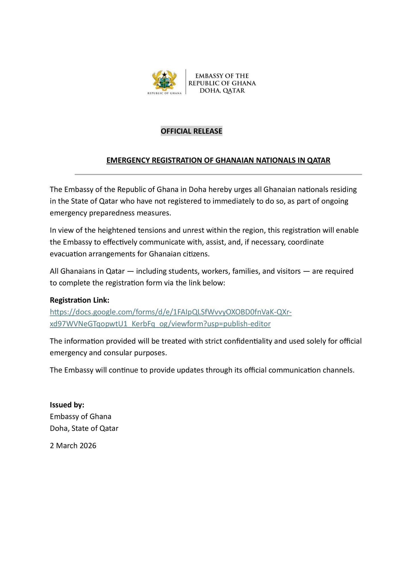 “The Embassy of the Republic of Ghana in Doha hereby urges all Ghanaian nationals residing in the State of Qatar who have not registered to immediately do so, as part of ongoing emergency preparedness measures,” the statement read.