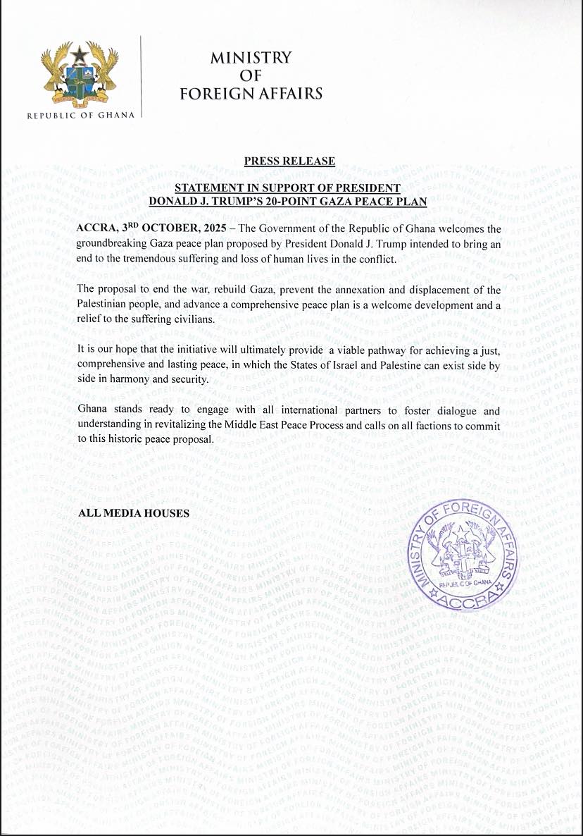 The Government of Ghana has welcomed the newly announced peace initiative for Gaza by U.S. President Donald Trump, describing it as a significant step toward achieving a durable resolution to the Israeli–Palestinian conflict.