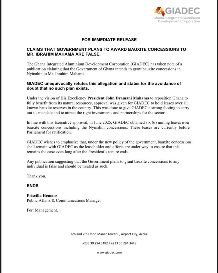 In a statement issued on Thursday, GIADEC noted a publication alleging that the government intends to grant bauxite concessions to Mr. Mahama, stressing that “no such plan exists.” The Corporation described the claims as misleading and urged the public to disregard them.