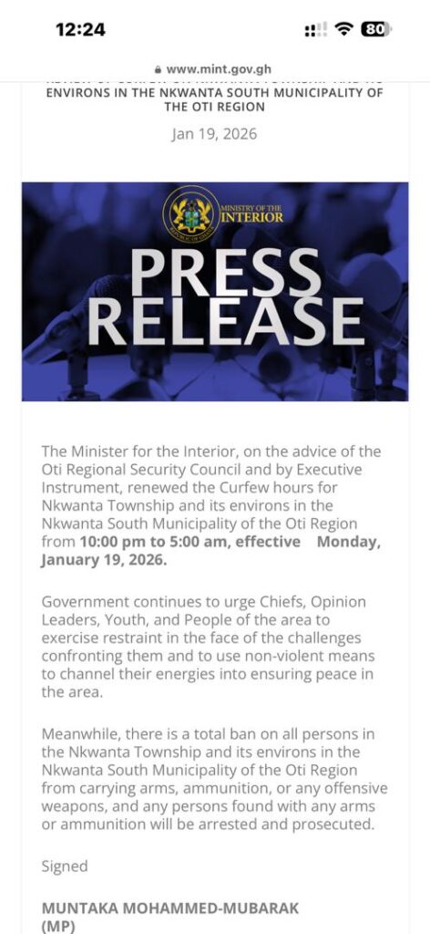 The Ministry of the Interior has announced a fresh extension of curfew hours for Nkwanta Township and nearby communities in the Nkwanta South Municipality of the Oti Region, acting on the advice of the Oti Regional Security Council.