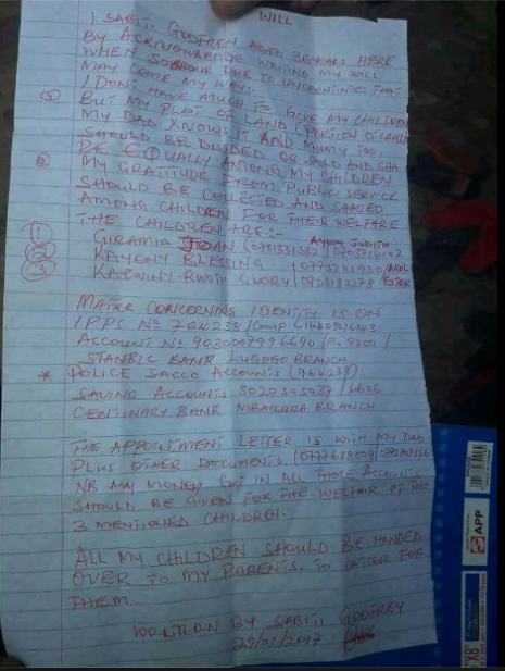 According to Facebook user, Basudde Sam who shared the photos, the police officer, Mr Godfrey Sabiti a father of three took his family to go conduct a HIV test and allegedly discovered he was positive, he murdered his wife then wrote a suicde note before he killed himself.