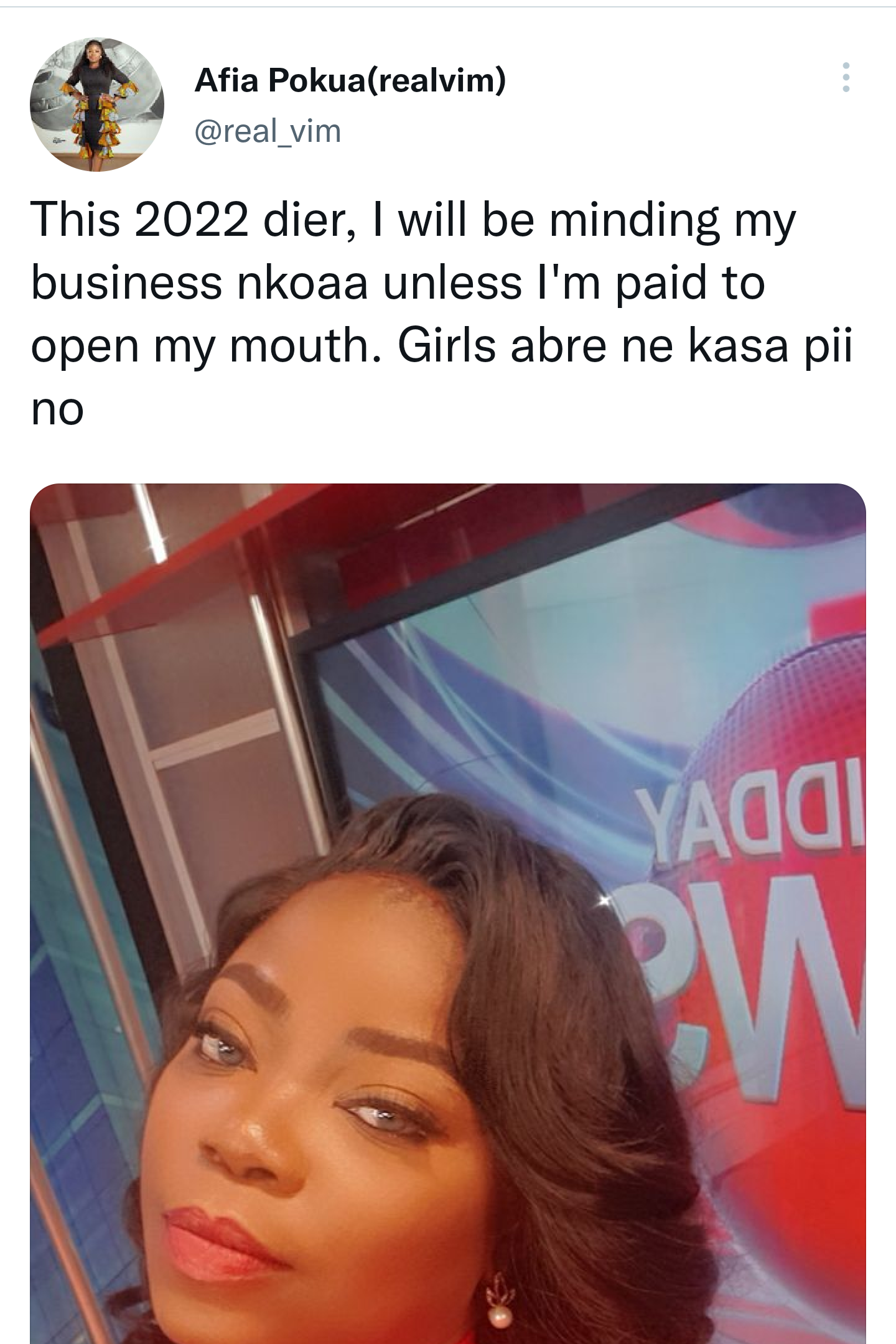 "This 2022 dier, I will be minding my business nkoaa unless I'm paid to open my mouth. Girls abre ne kasa pii no," she tweeted.