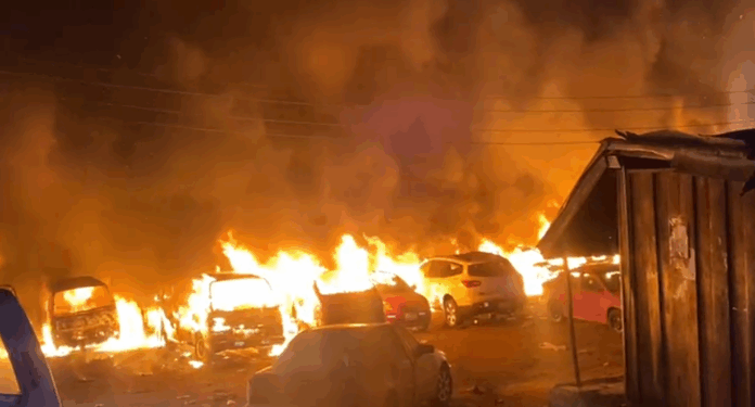 According to eyewitnesses, the flames spread with alarming speed across the mechanical enclave, engulfing parked cars, engines, spare parts, and large volumes of upholstery materials that further fueled the inferno.