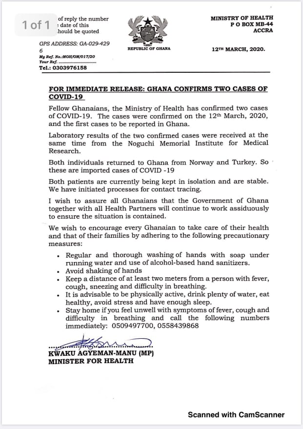 “Fellow Ghanaians, the Ministry of Health has confirmed two cases of COVID-19. The cases were confirmed on the 12th of March, 2020 and the first cases to be reported in Ghana”