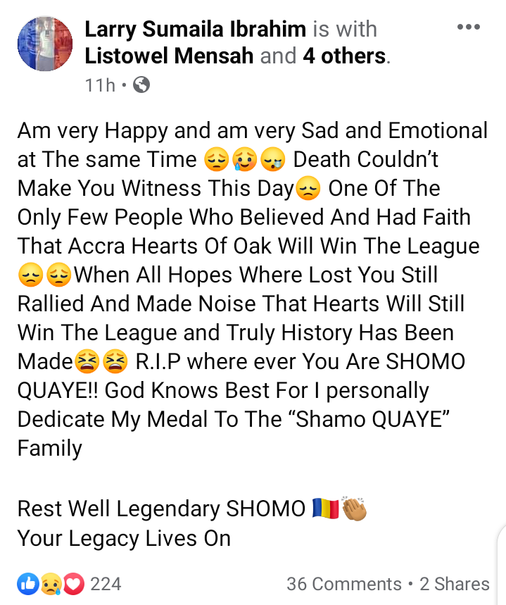 Larry writes... Am very Happy and am very Sad and Emotional at The same Time ??? Death Couldn’t Make You Witness This Day? One Of The Only Few People Who Believed And Had Faith That Accra Hearts Of Oak Will Win The League ??When All Hopes Where Lost You Still Rallied And Made Noise That Hearts Will Still Win The League and Truly History Has Been Made?? R.I.P where ever You Are SHOMO QUAYE!! God Knows Best For I personally Dedicate My Medal To The “Shamo QUAYE” Family
