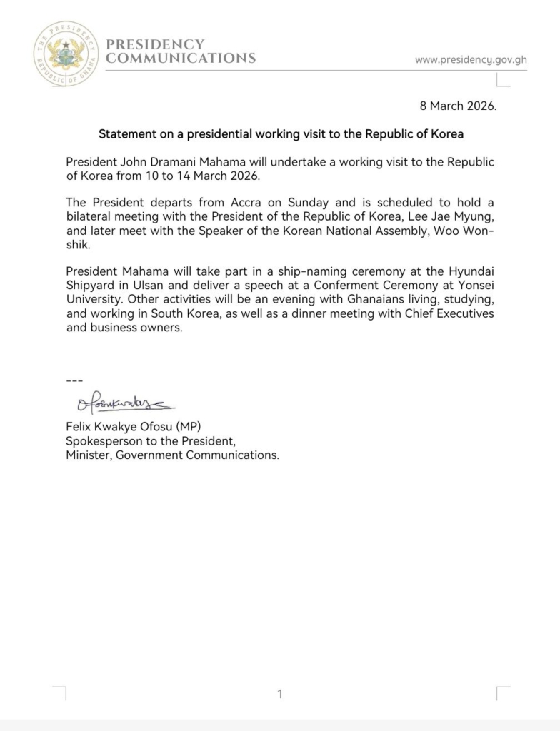 During the visit, President Mahama will hold bilateral discussions with the President of South Korea, Lee Jae Myung, focusing on expanding cooperation in key areas of mutual interest.