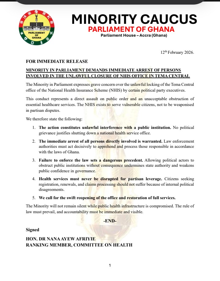 "The Minority in Parliament expresses grave concern over the unlawful locking of the Tema Central office of the National Health Insurance Scheme (NHIS) by certain political party executives," the statement said.
