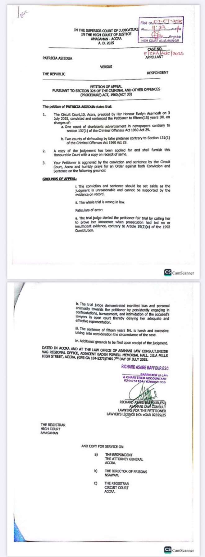 Lawyers representing Patricia Asiedua, popularly known as Nana Agradaa, have filed an appeal challenging her recent 15-year prison sentence, arguing that the ruling was “harsh, unreasonable, and unsupported by the evidence.”