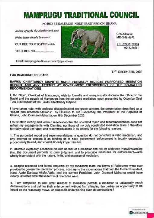 The Nayiri, Naa Bohugu Mahami Abdulai Sheriga, Overlord of Mamprugu, has formally rejected the mediation report on the Bawku Chieftaincy Dispute presented by Otumfuo Osei Tutu II, describing it as flawed, biased, and procedurally unsound.