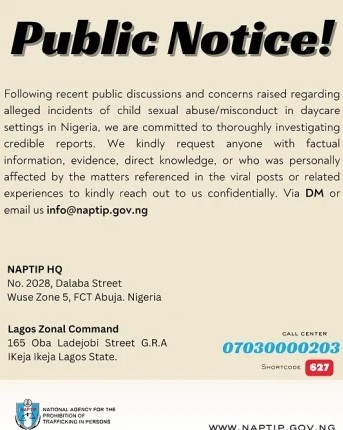 In response, the National Agency for the Prohibition of Trafficking in Persons (NAPTIP) issued a statement on February 24, 2026, affirming its commitment to investigating credible reports related to alleged incidents of child sexual misconduct in daycare settings.