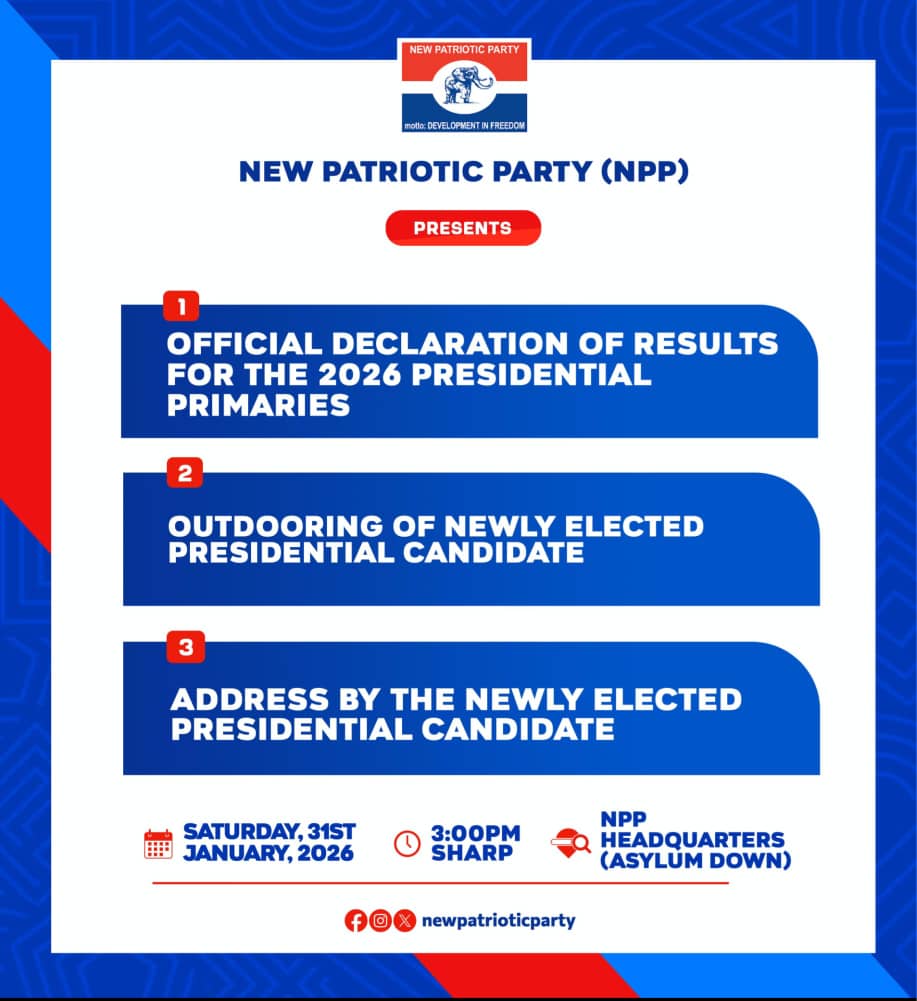 The New Patriotic Party (NPP) has announced that it will officially declare the results of its 2026 presidential primary and formally present its newly elected presidential candidate on Saturday, January 31, 2026.