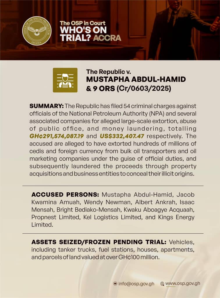 The Office of the Special Prosecutor (OSP) has expanded its criminal charges against the former Chief Executive Officer of the National Petroleum Authority (NPA), Dr. Mustapha Abdul-Hamid, and nine others, increasing the total counts from 25 to 54 following the discovery of new evidence.