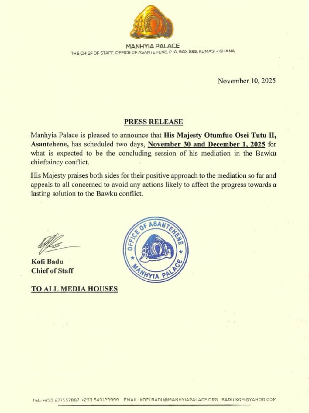 The Asantehene, Otumfuo Osei Tutu II, has set Sunday, November 30, and Monday, December 1, 2025, for what is expected to be the final phase of mediation in the long-standing Bawku chieftaincy conflict.