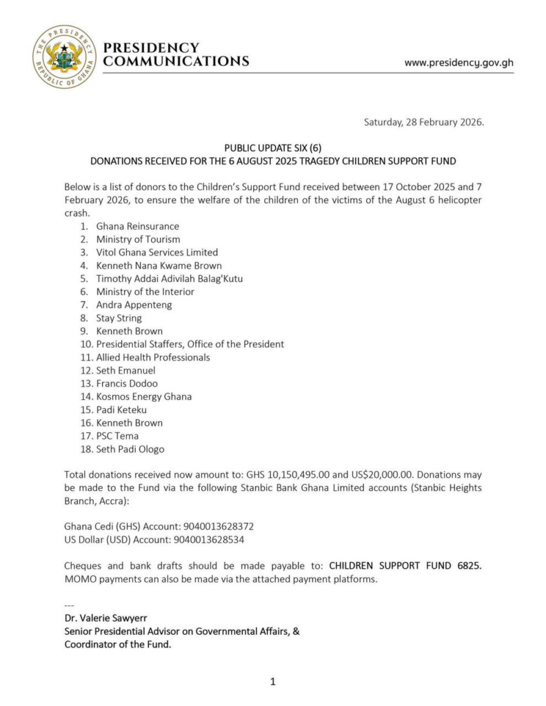 Support for the children left behind by the tragic 6 August 2025 helicopter crash in Ghana has received a significant boost, with donations exceeding GHS 10.1 million and US$20,000 as of 7 February 2026.