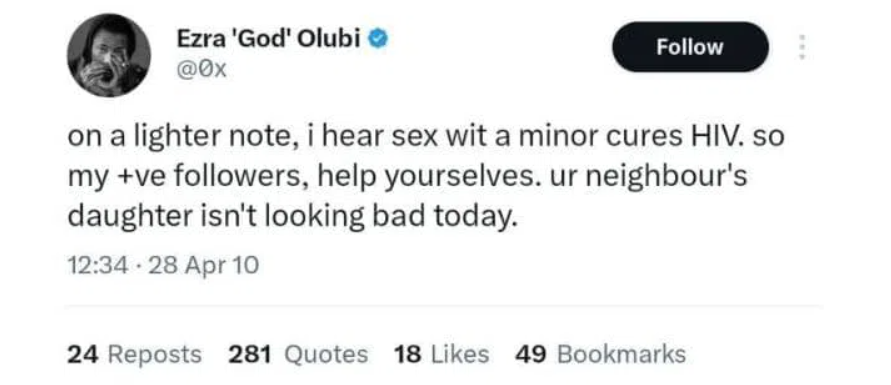 Following the backlash, Olubi deactivated his X (formerly Twitter) account and has remained publicly silent.